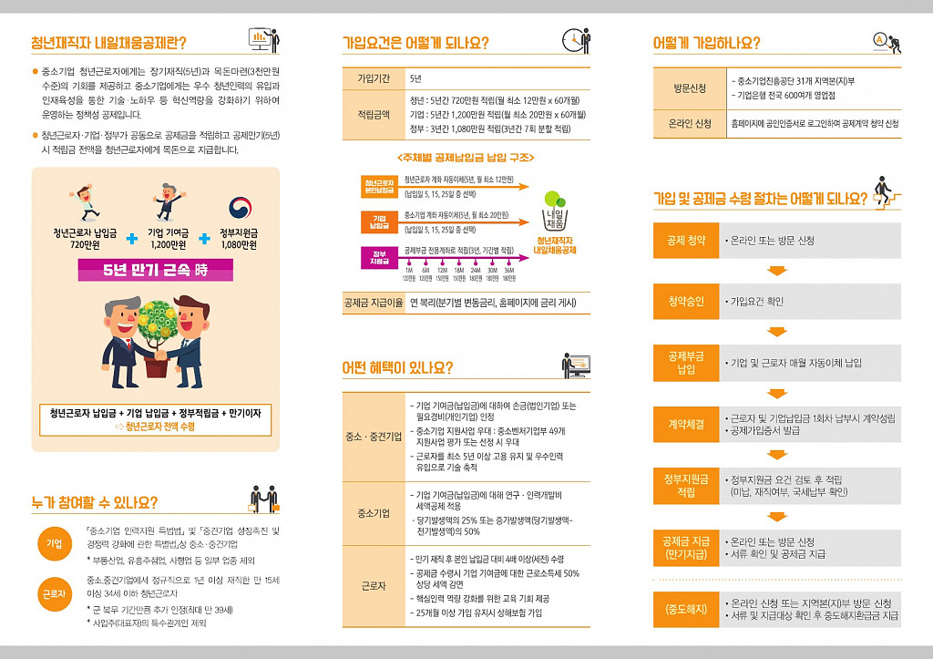 청년재직자 내일채움공제 : 중소기업 청년근로자에게 장기재직(5년)과 목돈마련(3천만원 수준)의 기회를 제공하고 중소기업에는 세재혜택 및 우수 청년인력의 유입과 인재육성의 기회를 제공하는 지원제도