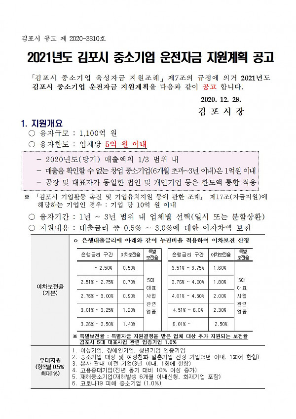 2021년도 김포시 중소기업 운전자금 지원계획 공고문